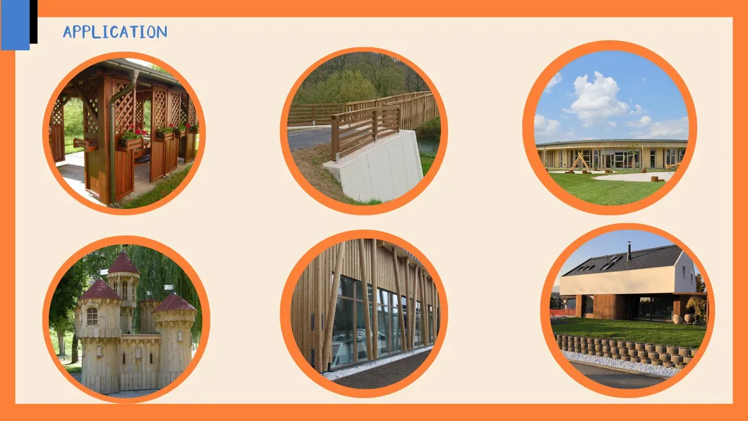 Preservative wood applications range from private courtyards to scenic spots: wooden boardwalks, flower boxes, outdoor floors, and ancient building restoration. It is ideal for bridge construction and environment-friendly house structures.